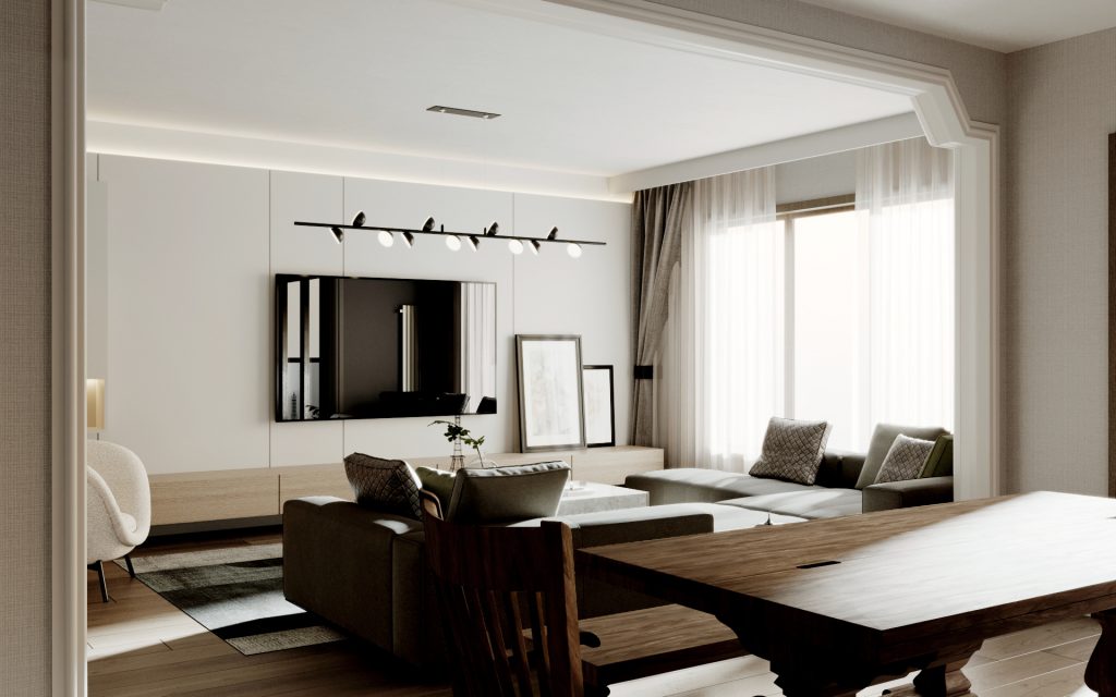A full apartment design with emphasis on lighter tones and a rather contemporary look.