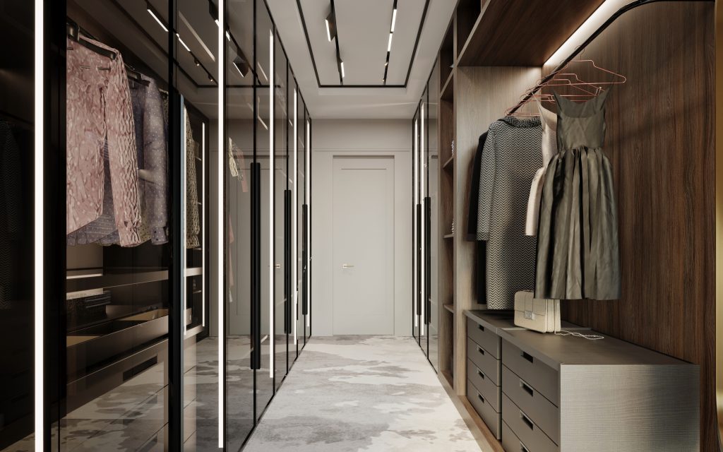 The overall design is a mixture of classical themes with some modern touches. Light colors are used with dark colored wood and brushed brass details.